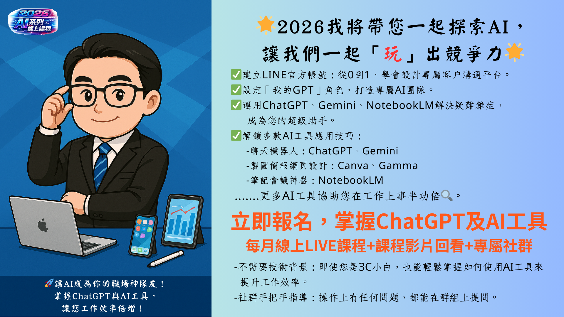 課程設計以「會用、用對、用出成果」為核心,完整涵蓋 AI 工具在職場與業務中的應用,包括文件撰寫、簡報圖像、影音製作、知識整理、內容產出以及自動化流程等。